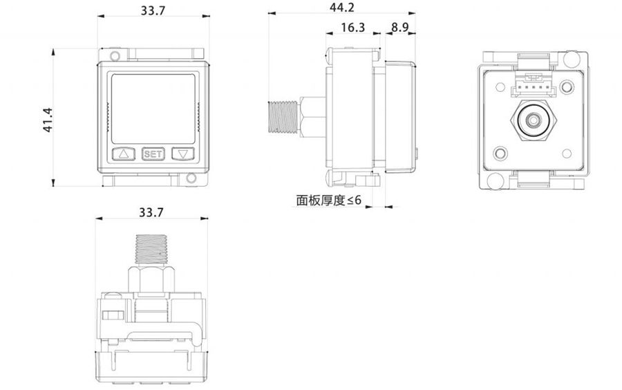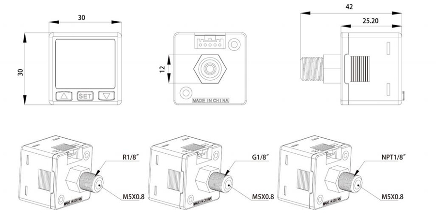 | 壓力接口 | 外螺紋R1/8、G1/8、NPT1/8,內螺紋M5 | ||